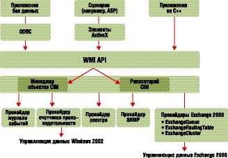 На Рисунке 1 изображены провайдеры WMI, в том числе провайдеры журнала событий (Event Log) и реестра (Registry), а также три провайдера Exchange 2000.
