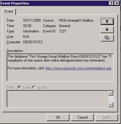 Журналы событий служат прекрасным источником информации для таких программ управления и контроля. Например, на Экране 1 показано сообщение о событии с ID 1221, где приведены результаты дефрагментации хранилища почтовых ящиков. Эта информация помогает контролировать размеры почтовых ящиков (см. врезку «Потеря сообщений»). Кроме данных, пригодных для анализа состояния системы, журналы событий хранят информацию о критических ошибках, например таких, как известная ошибка базы данных - 1018. Эта ошибка является сигналом бедствия для любого администратора Exchange. Она указывает на проблемы взаимодействия дисковой подсистемы и хранящейся на ней базы данных.