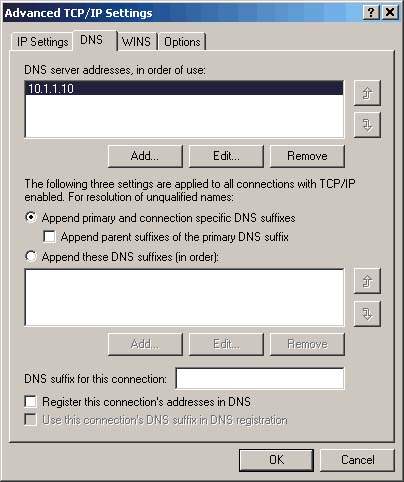 Динамическая регистрация имен по умолчанию обеспечивается всеми версиями Windows 2000, тогда как в DNS-серверах NT 4.0 такая регистрация имен не предусмотрена. Чтобы избежать лавины сообщений об ошибках DNS-сервера NT 4.0, нужно отключить функцию динамической регистрации имен, сбросив флажок Register this connection`s addresses in DNS на вкладке DNS окна Advanced TCP/IP Settings для сетевого адаптера, как показано на Экране 1. Эту функцию можно отключить как в процессе установки Windows 2000, так и после запуска и регистрации системы в сети.