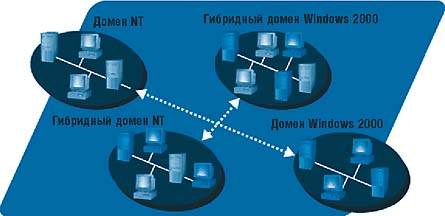 Но есть и другой путь: создать гибридный домен Windows 2000, в котором будут представлены контроллеры доменов (domain controllers, DCs), настольные системы и серверы на базе как Windows 2000, так и NT 4.0. В этом случае переход на новую ОС начинается, как правило, с модернизации существующего основного контроллера домена NT 4.0 до уровня контроллера домена Windows 2000. С моей точки зрения, это самый неудачный вариант. Дело в том, что модернизацию упомянутого контроллера домена приходится осуществлять на ходу, при этом работа сети может быть нарушена. Переход к системе Windows 2000 через гибридный домен Windows 2000 сопряжен с рядом сложностей, возникающих на этапе преобразования учетных записей и групп Windows NT 4.0 в формат AD и трансформации алгоритмов управления системами в эквивалентные групповые политики. К тому же в этом случае могут возникать проблемы, связанные с синхронизацией контроллеров доменов разных платформ и тиражированием файлов (так, в Windows 2000 не предусмотрена репликация файлов средствами NT LAN Manager, NTLM). Начинать миграцию с гибридного домена Windows 2000 - значит взваливать на себя такие задачи, как изучение и использование на практике особенностей реализации профилей пользователей в Windows 2000 и NT 4.0, а также выявление тех функций Windows 2000 Group Policy, которые применяются и не применяются к клиентам.