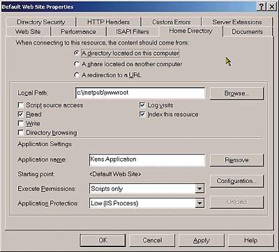 Чтобы повысить стабильность IIS, рекомендуется выполнять приложения с изолированными процессами в памяти. Однако в режиме изоляции процессов значительно снижается скорость выполнения приложений (хотя Windows 2000 работает с изолированными процессами лучше, чем NT). Чтобы определить, применяются ли приложением изолированные процессы, нужно выяснить, есть ли в нем компоненты COM+. Если в программе используются компоненты COM+, следует обратиться к Internet Service Manager (ISM) и открыть окно Default Web Site Properties. Убедитесь, что параметру Application Protection на закладке Home Directory присвоено значение Low (IIS Process), как показано на Экране 1. В режиме Low все процессы выполняются в пространстве процессов IIS, и достигается максимальная производительность. Недостаток этого режима заключается в том, что сбой компонента может привести к отказу IIS.