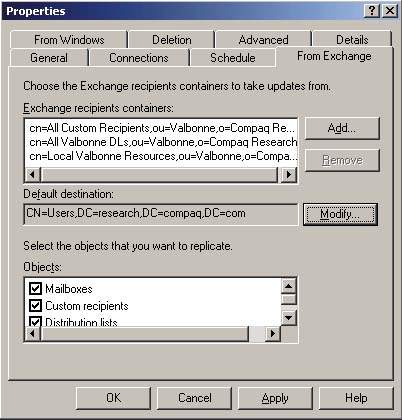 Просто определить CA как двустороннее и в дальнейшем создать произвольный набор контейнеров и организационных единиц (OU) недостаточно для определения двусторонней синхронизации. Например, если выбрать закладку From Exchange, в поле Exchange recipients container указать Recipients, в поле Default destination определить Exchange Server 5.5 Recipients, а затем на закладке From Win-dows в поле Windows Organizational Units указать Users и в поле Default destination - Recipients, то при такой настройке сконфигурировать двустороннее СА не удастся из-за несбалансированности синхронизации. С точки зрения ADC в данном случае отсутствует механизм репликации изменений в синхронизируемых объектах из контейнера Exchange Server 5.5 Recipients в контейнер SMALL-ED Reci-pients сервера Exchange Server 5.5.