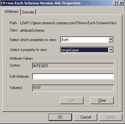 Во время установки ADC программа инсталляции сравнивает значение атрибута AD, определяющего версию схемы расширений, с версией вновь устанавливаемой схемы. Такую проверку можно выполнить вручную, если сравнить значение атрибута rangeUpper объекта ms-Exch-Schema-Version-Adc (см. Экран 1) со значением этого же атрибута, определенного в конце файла adcschema9.ldf. Данный файл находится в каталоге установки ADC. В версии ADC, предназначенной для тиражирования, атрибут имеет значение 4197. Если при установке ADC выяснится, что значения атрибута совпадают, то новые расширения установлены не будут. Для минимальной установки ADC (только расширений схемы) следует выполнить команду setup.exe /Schemaonly в каталоге установки ADC.