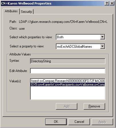 Прежде чем в очередной раз выполнить синхронизацию серверов Exchange 5.5 и 2000, ADC ищет в AD объект, соответствующий объекту-источнику в Exchange 5.5. Если синхронизация уже проводилась, то ADC ищет объект, имеющий атрибут msExchADCGlobalNames со значением, равным имени DN исходного объекта. Значение атрибуту присваивается при первой синхронизации, и это помогает отыскать объект репликации внутри AD. На Экране 3 показано значение этого атрибута для почтового ящика Exchange 5.5. Почтовый ящик имеет имя KarenW, находится в контейнере Recipients и принадлежит сайту Valbonne в организации Compaq Research.