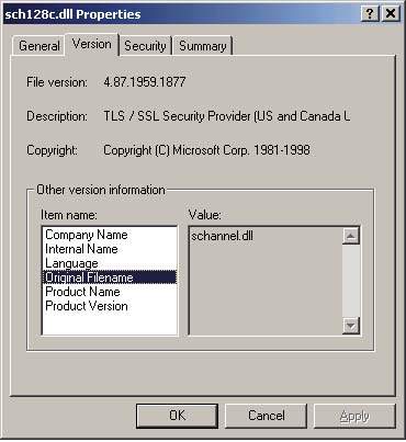 IE. По умолчанию браузер IE 5.5 использует усовершенствованные средства шифрования. Чтобы узнать номер версии изделия, надо выбрать пункт About Internet Explorer меню Help браузера IE. В файле ie5dom.inf, определяющем модернизацию средств шифрования браузеров IE 5.0 и IE 4.0, упоминается один уникальный файл, не входящий в модернизированную версию NT. Чтобы убедиться в том, что в системе используется оснащенный усовершенствованными средствами шифрования браузер IE 5.1 или IE 5.0, попробуйте найти в каталоге system32 файл sch128c.dll. Как показано на Экране 2, в описании Original Filename на вкладке Version окна Properties файла sch128c.dll говорится, что данный файл заменяет файл schannel.dll.