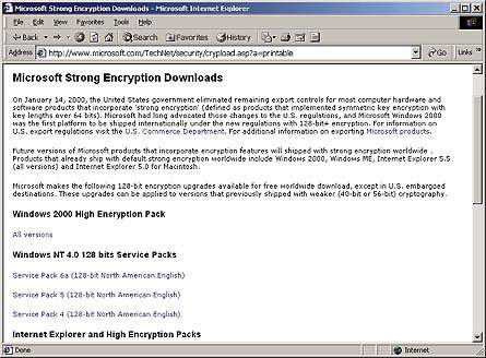 Средства модернизации более ранних версий браузера, обеспечивающие повышенную надежность средств шифрования данных, можно загрузить с Web-сайта Microsoft по адресу: http://www.microsoft.com/windows/ie/download/ 128bit/intro.htm. На узле выполняется проверка, откуда поступил запрос на загрузку ПО: из США или с другой территории. Доступ к файлам предоставляется лишь после того, как пользователь заполнит в оперативном режиме электронную форму с уведомлением об ограничениях на экспорт изделия.