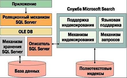 Независимо от варианта хранения текста, в SQL Server можно воспользоваться функцией полнотекстового, т. е. лингвистического, поиска. Концепция полнотекстового поиска в SQL Server основана на использовании Microsoft Search. Служба Micro-soft Search выполняет две основные функции: индексирование и поиск.
