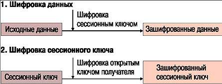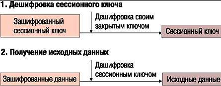 Симметричный алгоритм менее надежен, но работает намного быстрее, чем асимметричный. Поэтому в CryptoAPI применяется комбинация алгоритмов. Данные шифруются с помощью симметричного алгоритма с сессионным ключом, а сам сессионный ключ шифруется по асимметричному алгоритму открытым ключом получателя. Дешифровка происходит в обратном порядке: сначала закрытым ключом получателя дешифруется сессионный ключ, затем этим сессионным ключом дешифруются сами данные (см. Рисунки 2 и 3).