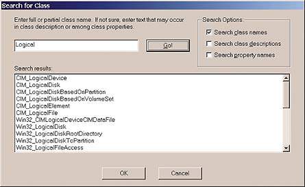 Затем нужно выбрать на данном компьютере объект управления: диск C. Точное имя этого компонента в CIM или WMI неизвестно, поэтому, вместо того чтобы просматривать сотни классов в списках CMI Studio, я щелкнула на кнопке Find (пиктограмма «бинокль» в верхней части левой панели). В диалоговом окне Search for Class, показанном на Экране 1, я ввела ключевое слово, которое, на мой взгляд, с большой вероятностью должно присутствовать в имени класса для диска C, и нажала Go!. Поскольку мне нужно было найти именованный раздел и я знала, что в операционных системах Windows такие разделы называются логическими дисками или логическими накопителями, я вела поиск по ключевому слову logical. Можно провести поиск по слову disk, но в таком случае придется просматривать гораздо больше результатов.