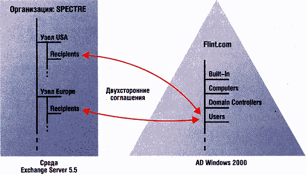 Соглашения СА из двух сайтов Exchange Server 5.5 в OU Users в AD.