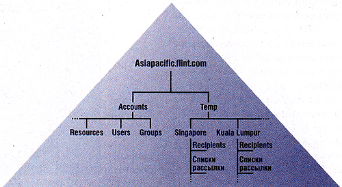 Иерархия OU в Windows 2000 с временной OU для целей миграции.