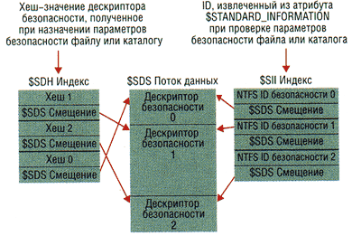 Благодаря универсальной индексации NTFS5 файлы и каталоги с одинаковыми параметрами безопасности эффективно используют общие дескрипторы. С помощью индекса $SII NTFS быстро отыскивает дескрипторы безопасности в файле $Secure в ходе проверок безопасности, а индекс $SDH позволяет быстро определить, имеется ли в файле $Secure ранее сохраненный дескриптор безопасности, пригодный для совместного использования с данным файлом или каталогом.