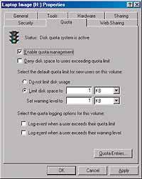 Системы Windows 2000 Server и NT Server часто используются в качестве файл-серверов. Слабое место NT — отсутствие у системного администратора встроенных инструментов для отслеживания и ограничения дискового пространства на сервере, занимаемого отдельными пользователями. Чтобы устранить этот пробел в функциональности NT, независимые поставщики выпускают несколько продуктов для управления квотами. Но в Windows 2000 уже есть базовые функции квотирования, которые во многих случаях позволяют обойтись без дополнительных инструментов. Функции управления квотами Windows 2000 построены на базе механизма квотирования NTFS (на томах FAT квоты выделить нельзя) в соответствии с моделью обслуживания отдельных томов и пользователей. Иными словами, администратор может использовать интерфейс, показанный на Экране 1, чтобы указать предупреждения и ограничить дисковое пространство, предоставляемое в распоряжение пользователя на томе NTFS.