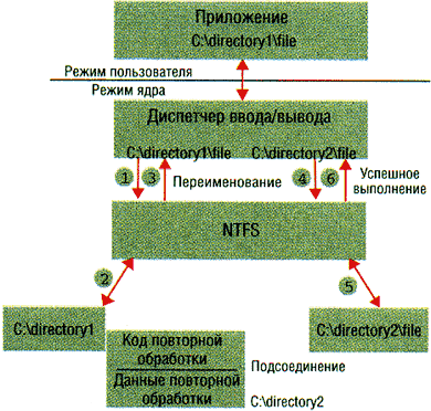 Точки подсоединения каталогов NTFS похожи на точки монтирования, и диспетчер ввода/вывода и Object Manager выполняют подсоединение так же, как монтирование. Однако точки подсоединения устанавливают связь с каталогами, а не с томами. Точки подсоединения Windows 2000 эквивалентны символьным ссылкам UNIX (но в отличие от символьных ссылок UNIX, точки подсоединения нельзя применять к файлам). Если создать точку подсоединения C:articlesdocuments, связанную с каталогом D:documents, то можно обращаться к файлам в D:documents, используя путь C:articlesdocuments. В точке подсоединения хранится информация о перенаправленном пути, и если NTFS обнаруживает точку подсоединения, то, как и в случае с точкой монтирования, диспетчер ввода/вывода изменяет имя и инициирует повторный поиск имени. Принцип действия точки подсоединения показан на Рисунке 3. Когда приложение открывает C:directory1file, NTFS обнаруживает точку повторной обработки в каталоге C:directory1, указывающую на каталог C:directory2. Диспетчер ввода/вывода изменяет имя на C:directory2file, и приложение в итоге открывает файл C:directory2file.