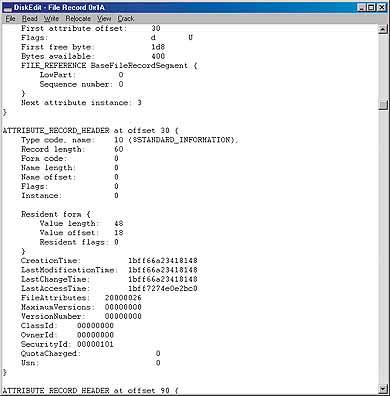 Для исследования внутренних дисковых структур NTFS существует несколько общедоступных инструментов. Среди них — DiskEdit, встроенный инструмент тестирования NTFS, по недосмотру Microsoft оказавшийся на компакт-диске Windows NT 4.0 Service Pack 4 (SP4), одна из самых мощных известных мне программ просмотра NTFS. DiskEdit, окно которого представлено на Экране A, позволяет ознакомиться со структурами, образующими файлы и каталоги, а также с данными атрибутов и преобразовать пути файлов и каталогов во входные коды таблицы MFT. Документация по DiskEdit отсутствует, но я опубликовал учебное пособие в сборнике бесплатных бюллетеней Sysinternals Newsletter (http://www.sysinternals.com/newsletter.htm). Чтобы использовать DiskEdit вместе с Windows 2000, необходимо скопировать файлы ifsutil.dll, ulib.dll, untfs.dll и ufat.dll из каталога winntsystem32 системы Windows NT в каталог, в котором нужно разместить DiskEdit.