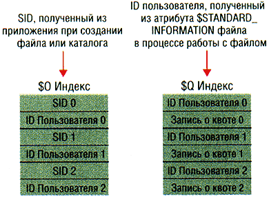 NTFS хранит информацию о квотировании в файле метаданных $Extend$Quota, состоящих из индексов $O и $Q. На Рисунке 4 показана структура этих индексов. Точно так же, как NTFS назначает каждому дескриптору безопасности уникальный внутренний ID безопасности, каждому пользователю назначается уникальный ID пользователя. Когда администратор определяет информацию о квоте для пользователя, NTFS назначает ID пользователя, соответствующий идентификатору SID пользователя. В индексе $O создается запись, которая отображает SID на ID пользователя, индекс сортируется по ID пользователя; в индексе $Q создается запись для управления квотой. Запись управления квотой содержит величину квоты, выделенной пользователю, а также размер занимаемого дискового пространства.