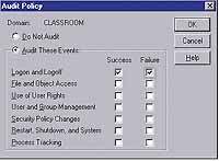 Политика аудита (Audit policy). Нужно выбрать Policies, Audit — откроется окно Audit Policy (см. Экран 2). Эта политика устанавливает тип событий безопасности, регистрируемых системой в локальном журнале безопасности (Security log). NT поддерживает семь категорий аудита. Среди них аудит процесса регистрации пользователей, доступа к файловой системе, выполнения программ, изменения политики безопасности, изменения настроек учетных записей. Систему можно настроить на запись событий аудита об успешном или неудачном завершении проверки для каждой категории.