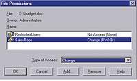 Чтобы просмотреть список ACL какого-либо файла, нужно открыть Windows Explorer и обратиться к контекстному меню файла. Выбрав Properties, следует открыть вкладку Security и щелкнуть Permissions. NT назначает пользователям кумулятивный доступ на основе его принадлежности той или иной группе. Например, на Экране 3 приведен список ACL для файла budget.doc. Члены группы SalesReps при работе с указанным файлом имеют разрешение Change (т. е. Read и Write). Однако пользователям группы RestrictedUsers в доступе к файлу отказано, поскольку для этой группы в ACL имеется указание No Access, которое перекрывает любое другое разрешение для групп.