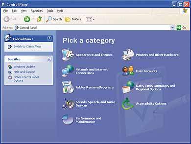 В отличие от панели управления Windows 2000, где программы, связанные с обслуживанием системы, перечислены по отдельности, панель управления XP (см. Экран 2) отображает ссылки на категории системных функций. Щелчок по ссылке — и появляется более детализированный список задач. Например, если выбрана категория Network and Internet Connections, XP выведет на экран диалоговое окно, содержащее некоторый список задач, доступных для выполнения, среди которых Set up or change your Internet connection, Create a connection to the network at your workplace, а также Set up or change your home or small office network. Выбрав любую из них, пользователь тем самым запускает программу Network Setup Wizard, которая будет руководить процессом выполнения задачи. Названное диалоговое окно также содержит значки Internet Options и Network Connections. Следует выбрать один из них для вывода окна, в котором настраиваются свойства указанного объекта. Если же пользователь предпочитает стиль интерфейса Windows 2000, достаточно переключиться на режим Switch to Classic View.