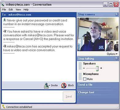 Для того чтобы воспользоваться Windows Messenger через Internet, сначала необходимо получить учетную запись в службе Microsoft Passport. Microsoft Passport — бесплатная служ-ба, выполняющая аутентификацию пользователя и инициализацию вызова. Корпоративные пользователи могут в качестве сервера аутентификации задействовать Microsoft Exchange 2000 Conferencing Server. Кроме того, готовящийся к выпуску продукт .NET Server позволяет осуществлять поддержку Windows Messenger. На Экране 4 представлен пример сессии видеоконференции с использованием Windows Messenger.