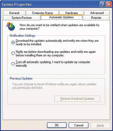 В XP Pro появилась новая функция управления — автоматическое обновление Automatic Updates. С ее помощью администраторы системы могут автоматически загружать и устанавливать важнейшие обновления (например, пакеты исправлений Service Pack), а также модули коррекции системы безопасности и обновления для драйверов устройств. Загрузка обновлений осуществляется в фоновом режиме, после чего система предлагает установить обновления. Включение и выключение этой функции выполняется на вкладке Automatic Updates (см. Экран 3) в меню Start, Control Panel, Performance and Maintenance, System.