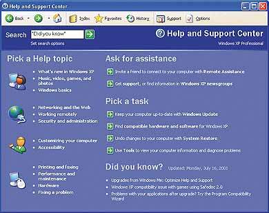 В том, что касается поддержки пользователя, XP демонстрирует исключительные возможности. Во-первых, в системе переработана справочная служба (Help). Поисковые возможности новой Help интегрированы с Web, поэтому поиск не ограничивается рамками локального компьютера, но затрагивает и базу данных Microsoft Knowledge Base. Дополнительно можно настроить связь с конференциями новостей Microsoft и новой секцией Did you know?, в которой Microsoft или OEM-партнер поддерживает ссылки на всевозможные Web-сайты. Каждый раз при обращении в Help and Support Center система связывается с Web-сайтом и обновляет заголовки в секции Did you know?. На Экране 6 показано основное окно Help and Support Center.
