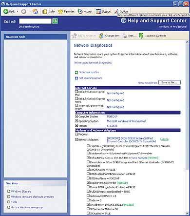 Одна из наиболее полезных новых коммуникационных функций XP — утилита Network Diagnostics, программа для диагностики и устранения системных и сетевых проблем. Network Diagnostics позволяет узнать текущий статус Internet-служб (почты, новостей), получить сведения о компьютере (системное имя, тип загрузки, объем RAM), информацию об операционной системе (номер сборки, дату установки, номер версии), а также проверить статус модемов и сетевых адаптеров. Чтобы запустить Network Diagnostics, нужно выбрать пункт Scan your system (Start, Control Panel, Network and Internet Connections, Network Diagnostics). На Экране 5 показаны результаты подобного сканирования.