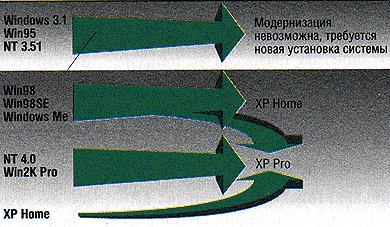 Те пользователи, у которых на домашнем компьютере уже установлена система Windows Me или Windows 98, скорее всего, предпочтут модернизировать текущую версию до XP Home. Корпоративные пользователи с Windows 2000 Professional и NT Workstation 4.0 с помощью процедуры обновления смогут перейти на XP Pro. Но если используется Windows 95 или более ранняя версия Windows, обновление невозможно. Придется устанавливать систему заново. На Рисунке 2 изображены возможные способы перехода на Windows XP.