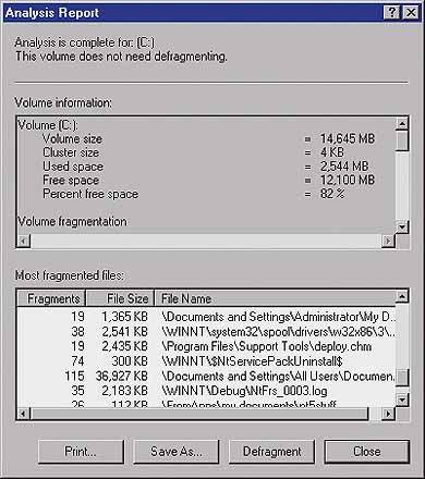 Если дефрагментация не нужна, система выдаст соответствующее сообщение. Нажав View Report, можно просмотреть отчет о проведенном анализе, содержащий список файлов с подробной информацией о фрагментации (см. Экран 2). Даже если программа сочла дефрагментацию ненужной, можно щелкнуть Defragment (в окне сообщений или в окне отчета), и все-таки выполнить ее. Это стоит сделать, если планируете инсталлировать большое по объему программное обеспечение (дефрагментацию диска всегда следует выполнять в том случае, если предстоит установить Exchange Server SQL Server или какое-либо другое громоздкое приложение). Если Disk Defragmenter обнаружит, что выполнение дефрагментации оправдано, об этом пользователь тоже узнает из сообщения на экране. Далее следует выполнить те же шаги — либо просмотреть отчет, либо запустить дефрагментатор.