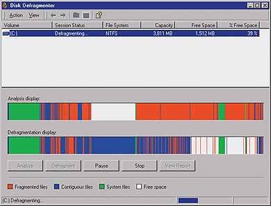 Я рекомендую запускать Disk Defragmenter сразу после инсталляции операционной системы и перед установкой любого программного обеспечения. И еще, всякий раз, когда с диска удаляется большое количество файлов, особенно во время удаления программного обеспечения с помощью встроенной процедуры, нужно выполнять дефрагментацию немедленно.