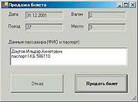 Через метод ExecuteNonQuery созданного ранее объекта comm отмечается факт продажи билета. ExecuteNon-Query возвращает число обработанных записей. В нашем случае выполнять такую проверку не требуется. Метод Commit объекта trans фиксирует транзакцию.