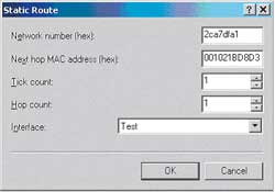 Следующий этап - активизация службы RRAS. При настройке необходимо выбрать вариант создания маршрутизатора. В оснастке RRAS, в левом окне появится раздел IPX Routing. Он включает в себя ряд служб и протоколов маршрутизации, в том числе Static Routes, RIP for IPX и SAP for IPX. Протокол Routing Infor-mation Protocol (RIP) для IPX — это протокол маршрутизации для обмена маршрутами IPX-сети, периодически рассылающий широковещательные сообщения. RIP для IPX работает во многом подобно протоколу маршрутизации RIP для IP. Протокол объявления служб Service Advertis-ing Protocol (SAP) позволяет узлам, предоставляющим те или иные услуги, например, серверам файлов и печати, сообщать имена своих служб и их адреса в объединенной IPX-сети. Эта информация собирается и распространяется IPX-маршрутизаторами и SAP-серверами (в частности, серверами NetWare). Клиенты NetWare, которым нужно подключиться к службе, обращаются к SAP-серверу для получения адреса этой службы в объединенной IPX-сети. Оба протокола устанавливаются автоматически и не требуют дополнительных настроек. Нужно только настроить статическую маршрутизацию между двумя подсетями.