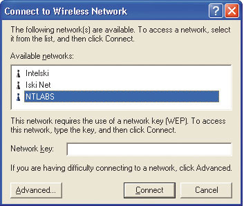 Затем я исследовал сетевые соединения: щелкнул правой кнопкой мыши на пиктограмме беспроводного соединения и выбрал из экранного меню функцию просмотра View Available Wireless Networks. На Экране 1 показано диалоговое окно Connect to Wireless Network со списком точек доступа, обнаруженных XP в лаборатории. Чтобы установить связь с точкой доступа, я просто выбрал SSID точки и щелкнул на кнопке Connect. Смена сетей происходила быстро, и система каждый раз автоматически изменяла параметры TCP/IP через DHCP. После того как я активизировал для каждой сети функции защиты 802.11b Wired Equivalent Privacy (WEP), для организации соединения потребовался еще один шаг - ввести сетевой ключ шифрования (WEP и проблемы безопасности будут подробно рассмотрены ниже). Ключ представляет собой пароль длиной от 5 до 13 символов ASCII, что соответствует 40- или 104-разрядному ключу шифрования. Ключ вводится в поле Network key диалогового окна на Экране 1. После того как введена информация о соединении с сетью, можно указать сетевые предпочтения, и XP сохранит информацию. В целом, процесс соединения XP с беспроводной сетью прошел относительно гладко, особенно по сравнению с аналогичной процедурой Windows 2000. При перемещении между различными сетями в Windows 2000 необходим беспроводный клиент от поставщика сетевой платы, а многие операции приходится выполнять вручную.