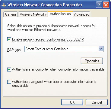 К сожалению, я смог рассмотреть функциональность 802.1x системы XP только теоретически. В то время, когда я тестировал XP с беспроводными устройствами, разработчики Microsoft завершали конфигурирование компонентов проводной сети, необходимых для работы 802.1x; среди этих компонентов - Microsoft Certificate Server, Active Directory (AD) и служба Microsoft Internet Authentication Service (IAS), которая выполняет функции сервера RADIUS. Кроме того, лишь немногие поставщики выпускают 802.1x-совместимое беспроводное оборудование. Таким образом, мне пришлось довольствоваться знакомством с данными, представленными на закладке Authentication клиента 802.1x (см. Экран 2). Эта закладка - единственное диалоговое окно настройки клиента XP 802.1x.