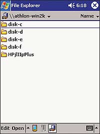 Устройства Pocket PC 2002 позволяют просматривать разделяемые сетевые ресурсы с помощью программы File Explorer, которая находится в папке Programs меню Start. После ввода пароля и имени на экране появляются папки и файлы (см. Экран 2), как на обычном рабочем столе Windows. Сетевой файл нельзя открыть напрямую, но можно создать локальную копию и редактировать ее с помощью встроенных программ, таких, как Microsoft Pocket Word и Microsoft Pocket Excel (указав на имя файла в File Explorer, нужно выбрать Copy из всплывающего меню, перейти в локальную папку и выбрать функции Edit, Paste).