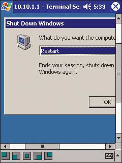Одно из главных достоинств Pocket PC 2002 - полнофункциональный клиент терминальных служб Windows, который работает как часы. Достаточно указать на пиктограмму Terminal Services Client в разделе Start, Programs, и устройство запросит имя сервера или IP-адрес, а затем потребуется ввести имя пользователя и пароль. После этого на дисплее Pocket PC будет представлен настоящий сеанс на базе терминальных служб.