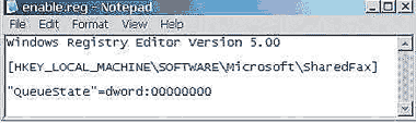 В первом примере упоминается текстовый файл «enable.reg», который нужно создать отдельно. Он должен содержать соответствующий параметр реестра, установленный в значение, предусматривающее прием звонков службой Microsoft Shared Fax. Команда «regedit.exe /i /s enable.reg» импортирует этот файл в реестр (при необходимости перед именем .reg-файла нужно указать полный путь!), а команды «net stop» и «net start» перезапускают службу Shared Fax. Службу необходимо перезапускать потому, что практически все программные продукты, запускаемые как службы и хранящие свои установки в реестре, за редким исключением, считывают их из реестра только в момент запуска. Приведенный пример .bat-файла является стандартным.
