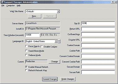 Объекты Passport работают на Web-сервере и выполняют все служебные задачи .NET Passport, такие, как аутентификация, шифрование, восстановление зашифрованных данных, чтение и запись cookies. С помощью Passport Manager (см. Экран 7) можно определить конфигурацию .NET Passport данного сайта (например, временное окно входа, принудительный вход, идентификатор языка, ID сайта, URL возврата, параметры cookies и сайтов-партнеров). Passport Manager можно использовать и для дистанционного конфигурирования Passport-совместимых сайтов. На тестовом Web-узле (current-login.passporttest.com) можно протестировать Web-сервер. Пример Web-узла, Adventure Works, — экземпляр узла электронной коммерции, на котором используются SSI и EP; с ним можно экспериментировать на Web-сервере или обращаться к нему через Internet по адресу: adventureworks.passport.com.