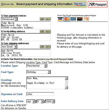 Учетная информация о потребителях, в частности регистрационные имена пользователей, пароли и номера кредитных карт, хранится в собственных базах данных многих Web-узлов электронной коммерции. В результате пользователю приходится помнить несколько наборов учетной информации — нередко отдельный набор для каждого сайта, где он что-либо заказывал. Пользователи, забывшие свое имя или пароль для регистрации на одном из сайтов, часто предпочитают отказаться от посещений, чтобы избежать хлопот, связанных с получением новой учетной записи. Кроме того, многие потребители из соображений конфиденциальности и безопасности нередко отказываются от регистрации и получения учетной записи, чтобы не открывать личную информацию (например, дату рождения или пол).