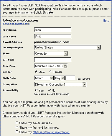 | Экран 1. Профиль пользователя в .NET Passport. |