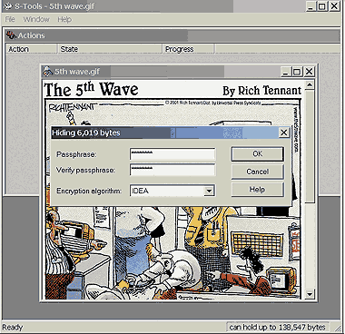 Для примера я выбрал в качестве носителя файл 5th_wave.gif (cover_image) и перетащил его на окно программы. В примечании в нижней строке сказано, что в файле можно спрятать изображение до 138,547 байт. Я выбрал файл virusdetectioninfo.txt размером 14 Кбайт и перетащил его на изображение. На Экране 2 показано открывшееся диалоговое окно, в котором сообщается, что будет спрятано 6019 байт данных, и предлагается ввести дополнительную фразу — пароль для шифрования скрываемого текста. Я дважды ввел ключевую фразу и подтвердил шифрование с предлагаемым по умолчанию алгоритмом IDEA.
