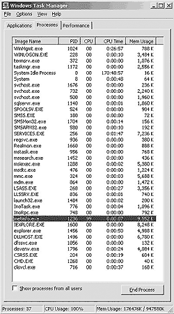 Для этого требуется открыть утилиту Task Manager и щелкнуть на закладке Processes. На экране появится список активных процессов (см. Экран 1). Чтобы рассортировать процессы по показателю «использование центрального процессора», следует щелкнуть на заголовке столбца CPU. Из списка будет видно, какой процесс монополизирует время процессора. Если проблема связана с IIS, то «нарушителем» будет inetinfo.exe, внепроцессный (out-of-process, OOP) исполняемый файл dllhost.exe (Windows 2000) или mtx.exe (Windows NT 4.0). Если задействована служба Microsoft Indexing Service, то виновником высокого коэффициента использования центрального процессора может быть cidaemon.exe. Этот процесс создает и обновляет каталог Index, он обычно занимает много процессорного времени. Но cidaemon.exe работает с низким приоритетом, поэтому, как правило, не снижает производительность системы даже при высокой нагрузке на центральный процессор. Если процессор монополизирован любым другим процессом, то проблема, скорее всего, с IIS не связана.