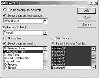 В Windows 2000 нужно открыть Performance Monitor, а затем щелкнуть на пиктограмме View Log File Data панели инструментов и выбрать файл журнала (см. Экран 2). Далее следует добавить счетчик коэффициента использования потоками центрального процессора. Диалоговое окно Add Counters открывается щелчком на пиктограмме Add Counters панели инструментов (см. Экран 3). Из раскрывающегося списка Performance Object следует выбрать Thread (поток). Установив флажок Select counters from list («выбрать счетчики из списка»), нужно выбрать пункт % Processor Time. Затем, установив флажок Select instances from list («выбрать экземпляры из списка»), можно выбрать все потоки inetinfo. Открыв консоль Performance Monitor, следует убедиться, что пиктограмма Highlight на инструментальной панели активизирована (см. Экран 4). Те же действия нужно выполнить и на сервере NT.