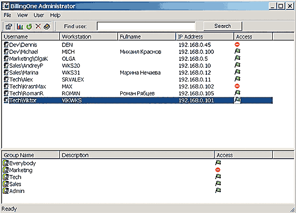 Отображение пользователей и групп в утилите BillingOne Administrator.