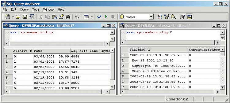 Результат выполнения sp_enumerrorlogs и sp_readerrorlog.