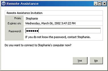 - "Эксперт" получает от "новичка" запрос и устанавливает соединение. На Экране 3 показан пример приглашения Remote Assistance. "Эксперт" может также предложить "новичку" помощь. В этом случае необходимо соблюдать еще одно условие: обе системы-участницы должны быть членами одного домена или членами доверяющих доменов. Таким образом, этот сценарий может быть реализован в локальных сетях компаний, но непригоден для большинства домашних пользователей.