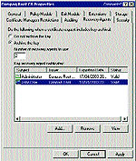 Автоматическая регистрация пользователей требует внесения конфигурационных изменений в оснастки MMC Certificate Templates и Group Policy. Для включения автоматической регистрации на уровне шаблона следует загрузить оснастку Certificate Templates, открыть шаблон, перейти на закладку Security и предоставить пользователям или группам право доступа Autoenroll. Чтобы включить автоматическую регистрацию на уровне GPO, следует открыть оснастку Group Policy, перейти по адресу Computer ConfigurationWindows SettingsSecurity SettingsPublic Key Policies, открыть диалоговое окно Autoenrollment Settings Properties (см. Экран 2). Как и в Windows 2000, настройка автоматической регистрации компьютеров здесь осуществляется в контейнере Automatic Certificate Request Settings из GPO Public Key Policies.