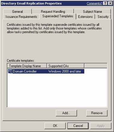 ? Автоматическая замена старых версий сертификатов на последние версии, содержащие новые свойства. Это можно сделать при помощи закладки Superseded Templates, как показано на Экране Б. Автоматическая замена является очень мощным средством в сочетании с возможностью автоматической регистрации. Замечательным примером может служить шаблон Directory Email Replication, замещающий более старый шаблон Domain Controller. Поскольку автоматическая регистрация в шаблоне Directory Email Replication разрешена, все контроллеры доменов DC автоматически (т. е. без вмешательства какого-либо пользователя или администратора) получат новый сертификат Directory Email Replication.