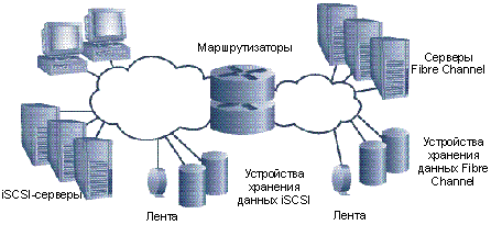 Сети хранения данных Fibre Channel и iSCSI, связанные через маршрутизатор.