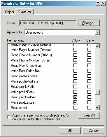 Теперь необходимо вернуться к оснастке Active Directory Users and Computers и щелкнуть правой кнопкой мыши по OU, содержащей учетную запись пользователя, параметры которой будут администрировать сотрудники службы технической поддержки. Нужно перейти на вкладку Security, затем щелкнуть Advanced, New. В диалоговом окне следует ввести имя учетной записи пользователя или учетной записи группы, которым требуется назначить полномочия или выбрать имя из списка прокрутки. Далее нужно ввести имя службы технического сопровождения и нажать OK. Чтобы просмотреть список полномочий уровня объекта, следует щелкнуть по области Apply onto («Применить к») и выбрать User objects («Объекты»). Затем необходимо перейти на вкладку Properties и установить флажки Allow («Разрешено») для атрибутов Read pwdLastSet и Write pwdLastSet (см. Экран 2). Если эти атрибуты не видны, нужно перезапустить оснастку Active Directory Users and Computers. Также можно установить флажки Allow для атрибутов Read Lockout Time и Write Lockout Time, если необходимо предоставить такие права сотрудникам службы технического сопровождения. Те же шаги следует повторить для каждой организационной единицы OU, а управление ими поручить службе технической поддержки.